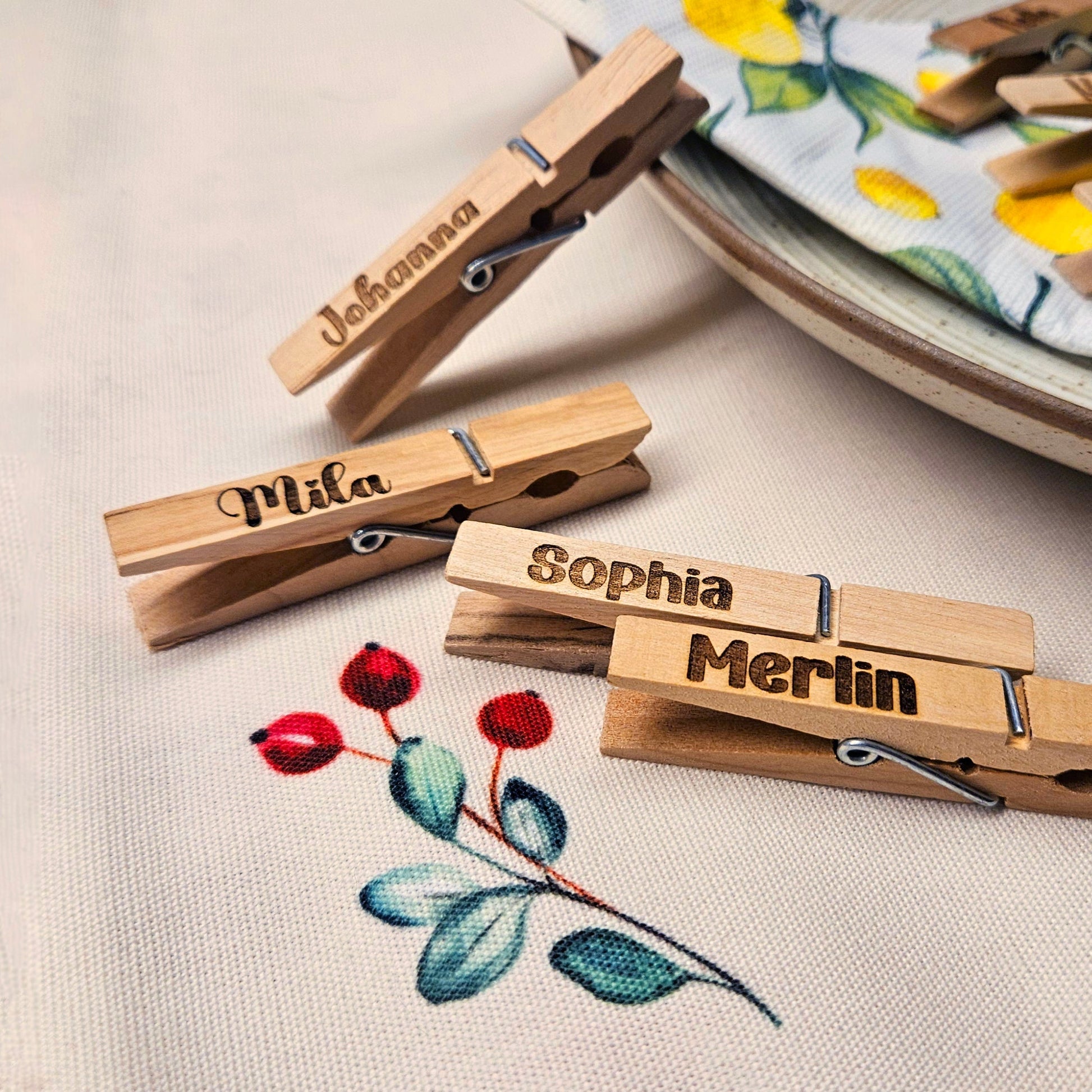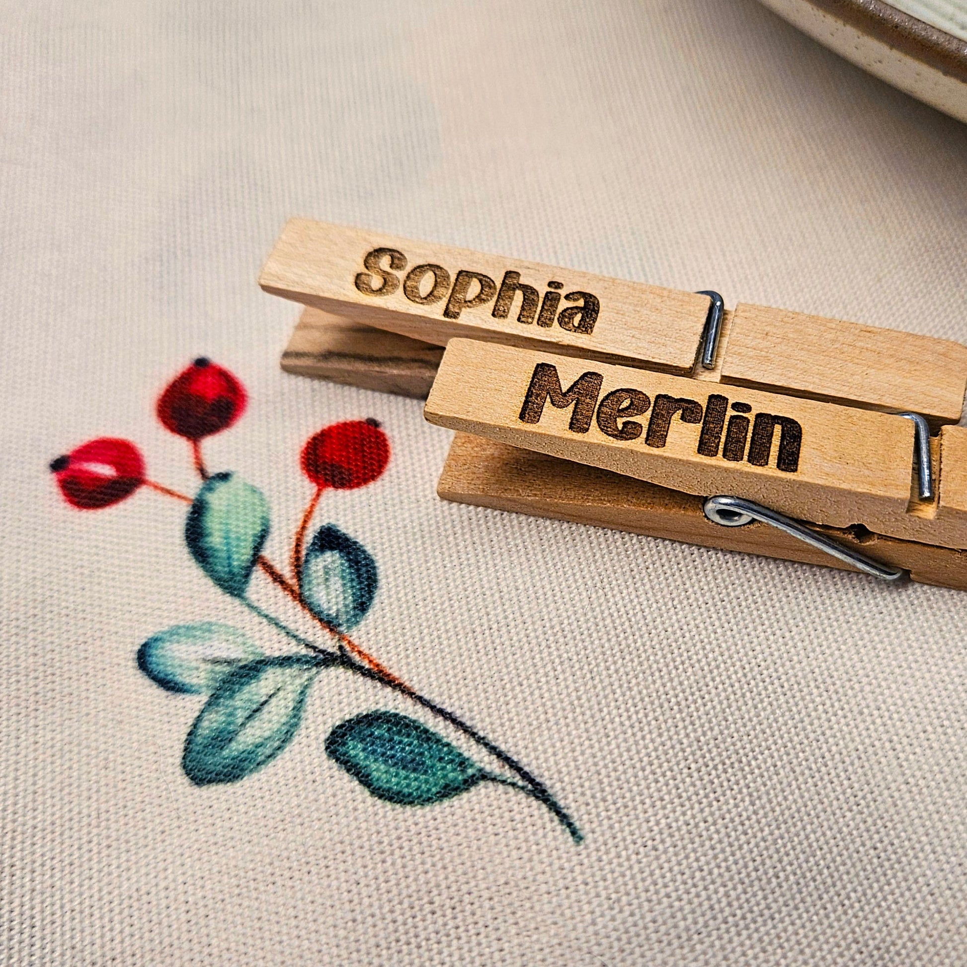 Bringen Sie mit unseren liebevoll handgefertigten Holzklammern einen Hauch von Persönlichkeit in Ihren Alltag. Jede Klammer wird nach Ihren Wünschen individuell graviert – sowohl auf der Vorder- als auch auf der Rückseite. So entstehen einzigartige Details, die für verschiedene Gelegenheiten ideal sind.
